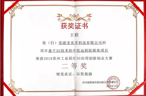 蕪湖圣美孚科技公司以“基于5G技術(shù)的中醫(yī)遠程醫(yī)聯(lián)體項目”參加此次大賽,與參賽的各種人工智能、大數(shù)據(jù)和物聯(lián)網(wǎng)等5G示范應用場景的高新科技項目同臺亮相,于決賽現(xiàn)場進行了路演,闡述了基于5G技術(shù)的中醫(yī)遠程醫(yī)聯(lián)體項目成果并接受大賽評委的評審問答,經(jīng)過一番角逐,我公司參賽的“基于5G技術(shù)的中醫(yī)遠程醫(yī)聯(lián)體項目”榮獲2019年蘇州工業(yè)園區(qū)5G應用創(chuàng)新創(chuàng)業(yè)大賽二等獎。